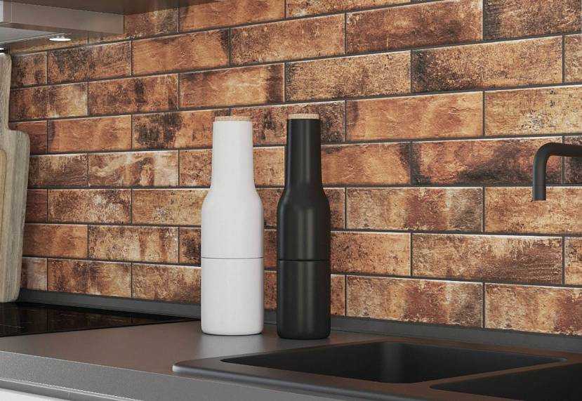 Декор не требует от человека профессиональных навыков штукатура или каменщика. Внешне кухня под кирпич выглядит более эстетично, чем оголенная стена. Сырье не боится механических повреждений, устойчиво к воздействию высоких температур и влаги. Для отделки внутренних помещений выпускают два вида плитки: