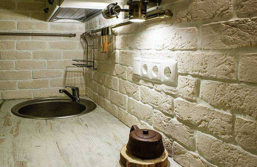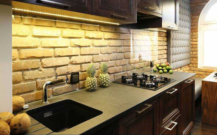 Для отделки стен кухни под камень используют декоративные накладки. Пластиковые панели безупречно имитируют внешний вид кирпича (цвет, поверхность, текстуру), скрывают дефекты на стенах и легко устанавливаются. Материал не боится загрязнений, влаги и плесени, при повреждении можно заменить элемент на новый. К минусам отделки относят: