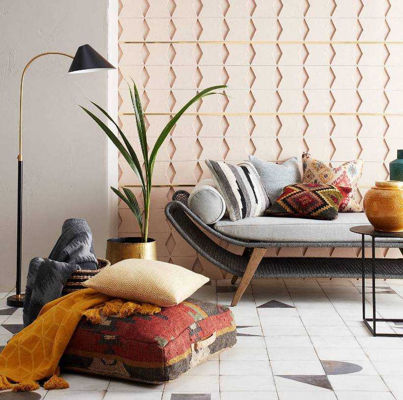 - Бохо – используйте цветные подушки с азиатскими, марокканскими, африканскими мотивами. Ткани могут быть практически любыми: лен бархат, мешковина и т.д.