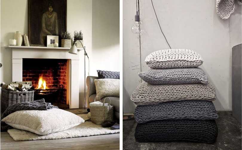 Для этих вариантов целесообразно выбирать новую пряжу. Она будет пушистой и уникальной. Фактурная вязка очень интересно смотрится как дополнение к деревенскому и скандинавскому стилю оформления. Учитывайте то, что нитки для ручной работы должны быть прочными и достаточно плотными. Вязку лучше осуществлять спицами. Так между петлями получается минимальное расстояние. Зачастую вяжут чехол для декоративного элемента. Наперник изготавливается из плотных текстильных материалов.