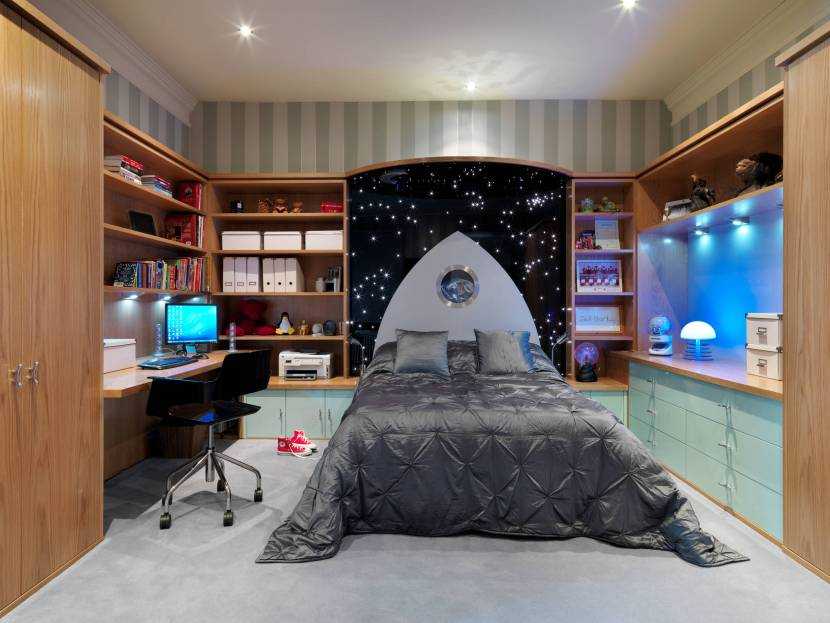 Во избежание конфликта интересов, важно первоначально правильно расставлять приоритеты, объяснять сыну или дочери, что на первом месте всегда безопасность, поэтому кровать должна быть удобной здесь и сейчас и через какое-то далекое время, важно, чтобы шкаф вмещал все имеющиеся вещи, а светильники, люстры выдавали нужное количество света. Поэтому взрослым необходимо настаивать на фундаментальных принципах, а детям можно доверить выбор цвета, формы и стиля.. Строгость – отличительна черта комнаты для подросткаИсточник yandex.net