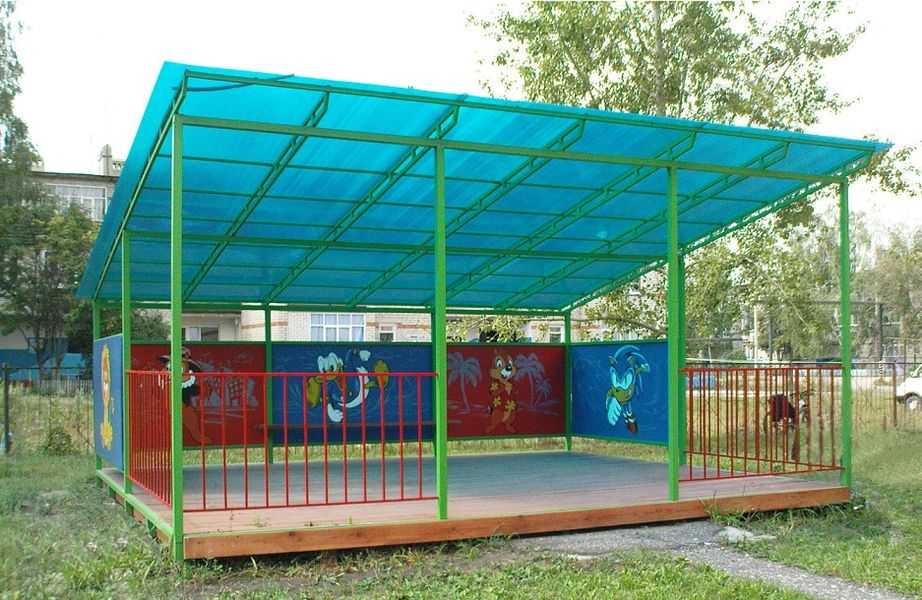 Внутри можно установить лавочки, стулья, шкафчик для хранения игрушек. После активных игр малыши могут воспользоваться мольбертом, дошкольникам пригодится магнитная доска с цифрами и буквами, счеты. Стены украшают яркими рисунками, наклейками. Участок, на котором расположена беседка, должен хорошо просматриваться, чтобы воспитанники находились под контролем. Хорошо, если вблизи растет дерево, дающее тень.