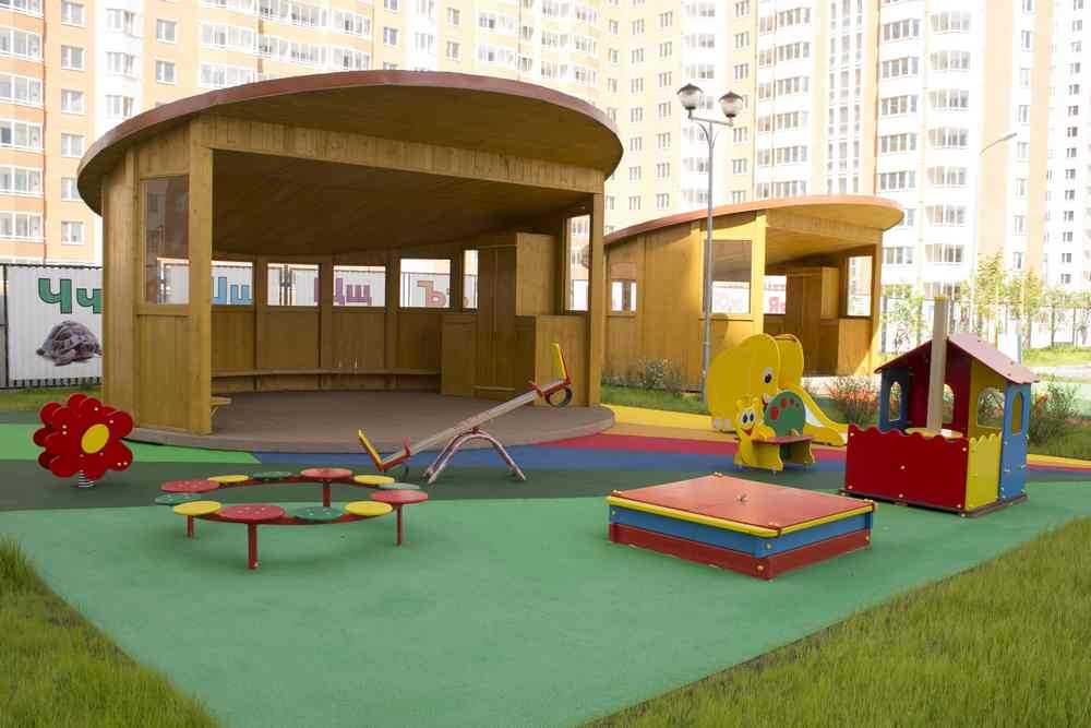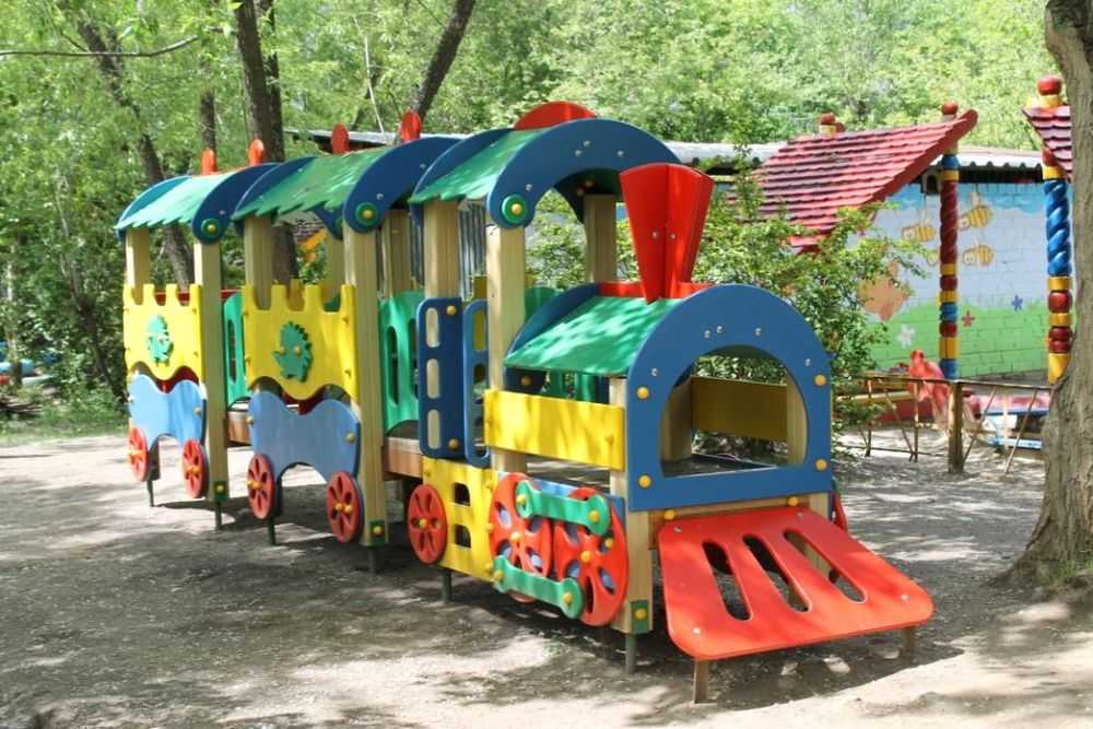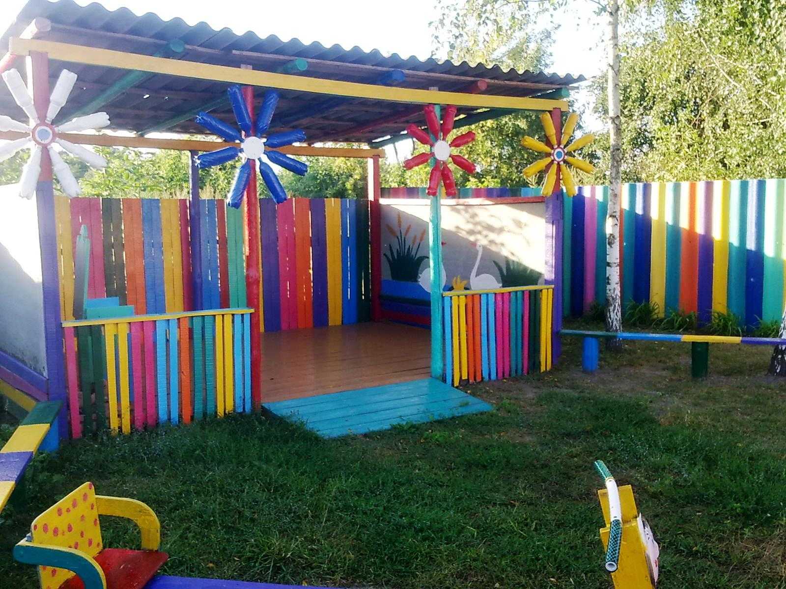 Для защиты от агрессивного солнца, дождя, ветра и сквозняков дизайн интерьера детского сада предполагает использование беседок. Это могут быть домики с мебелью внутри, навесы, паровозики, машинки, шалаши, крепости и другое.