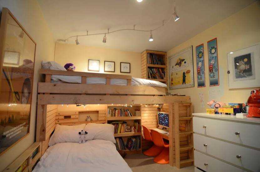 Если в вашем распоряжении маленькая площадь, сэкономить метры поможет мебель-трансформер. Это могут быть откидные кровати и столики, выдвижные из подиума спальные места, раскладные диваны, встроенные шкафы, комоды, двухъярусные кровати с гардеробом или креслами под ними. Если для разграничения помещения вы используете шкафы, обязательно создайте дополнительный свет для дальней части спальни.