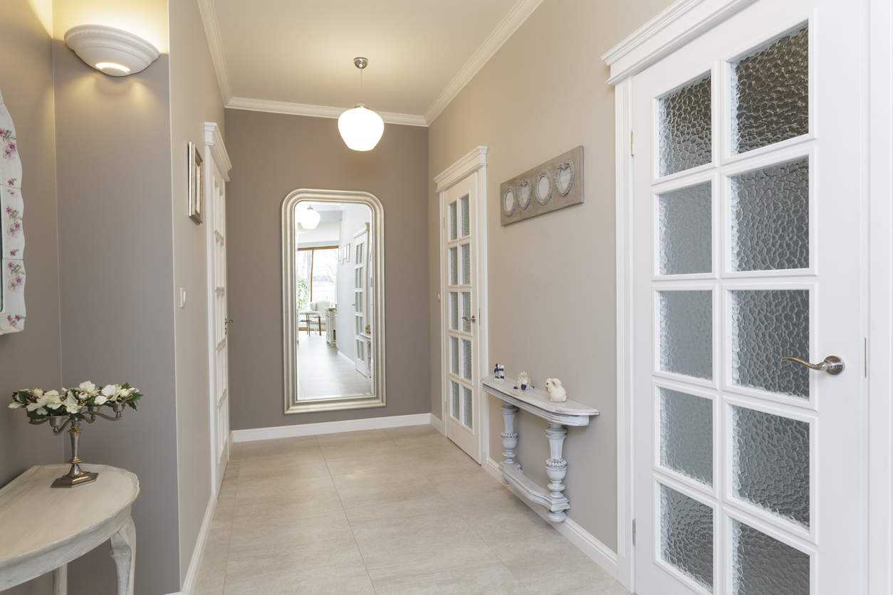 Интересная облицовка стен на 1/3 высоты также представляет практичное, но также очень эстетичное решение для пространства ухоженного коридора. Подобный дизайн приносит нотки английского стиля и защищает стены от брызг водой или грязи.