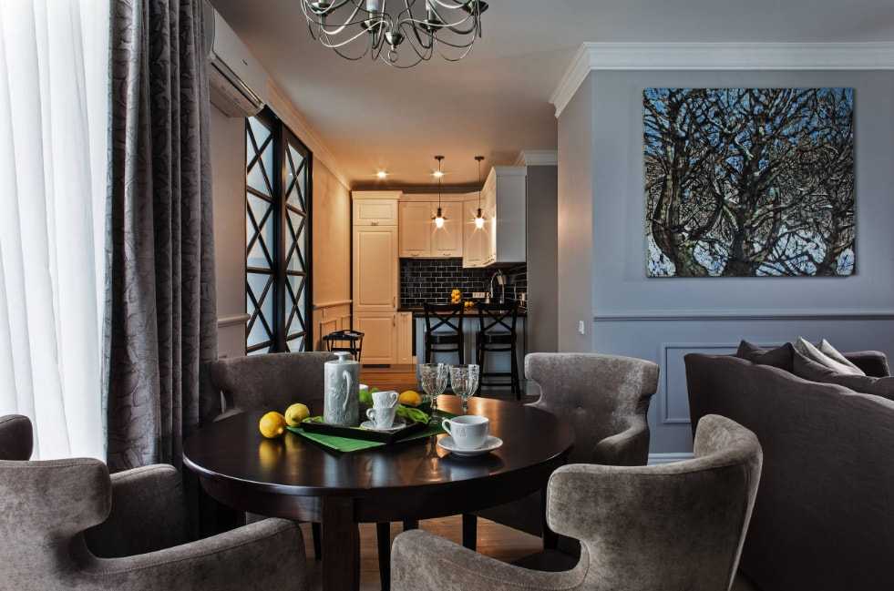 Один из самых распространенных вариантов — классический стиль, который может полностью раскрыться лишь в просторном помещении с высокими потолками и большими окнами. Красивое оформление стен в столовой гостиной — важная деталь классики. Их украшением служит декоративная штукатурка или узорчатые обои.