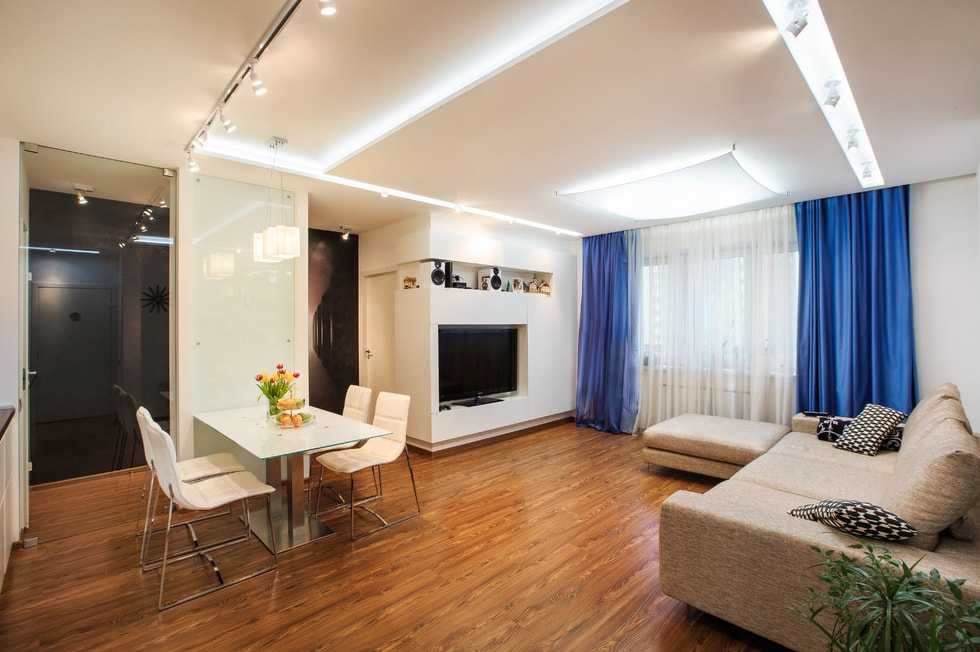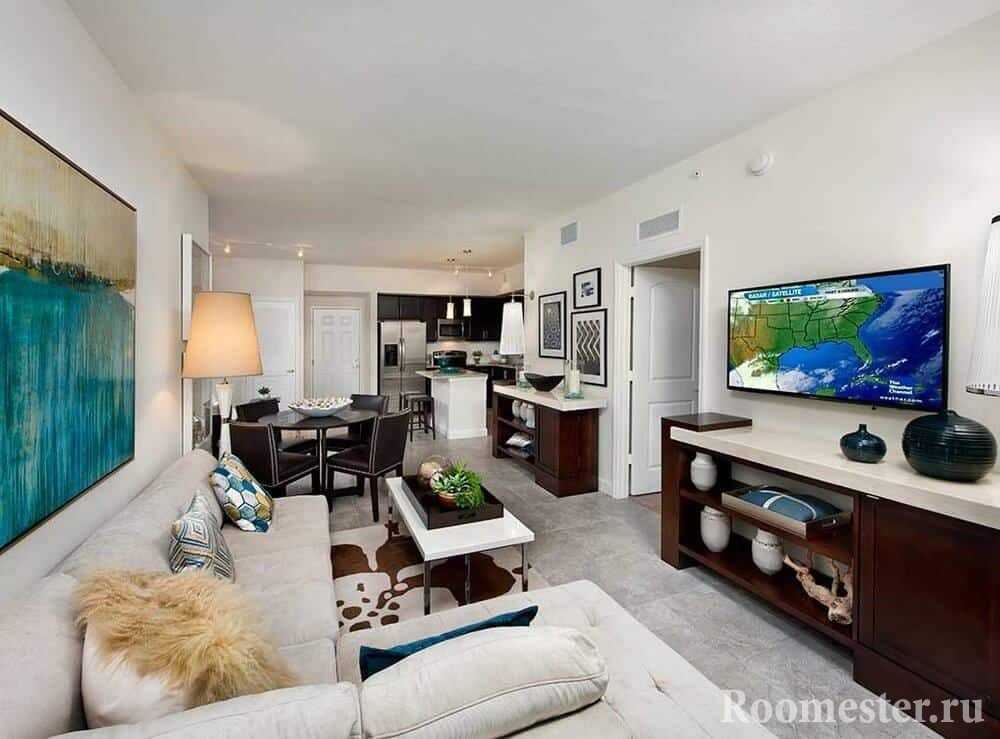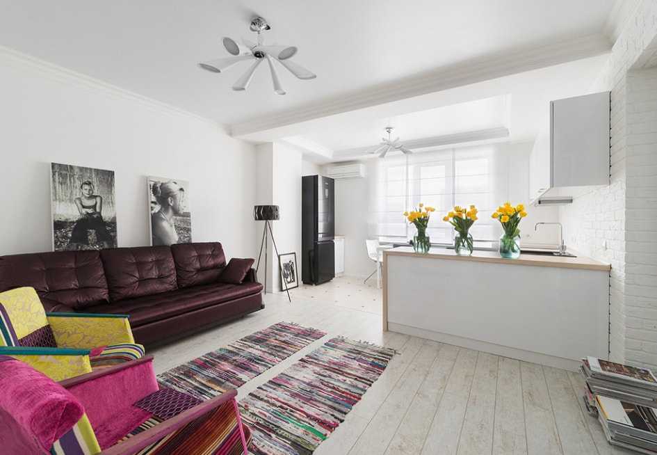 Чтобы сделать красивым и уютным такой интерьер – используйте разную отделку для потолка, стен и полов. Поделите помещение на зоны: для кухни – яркие фасады, многоступенчатый потолок, для прихожей – практичные напольные покрытия или решетки.