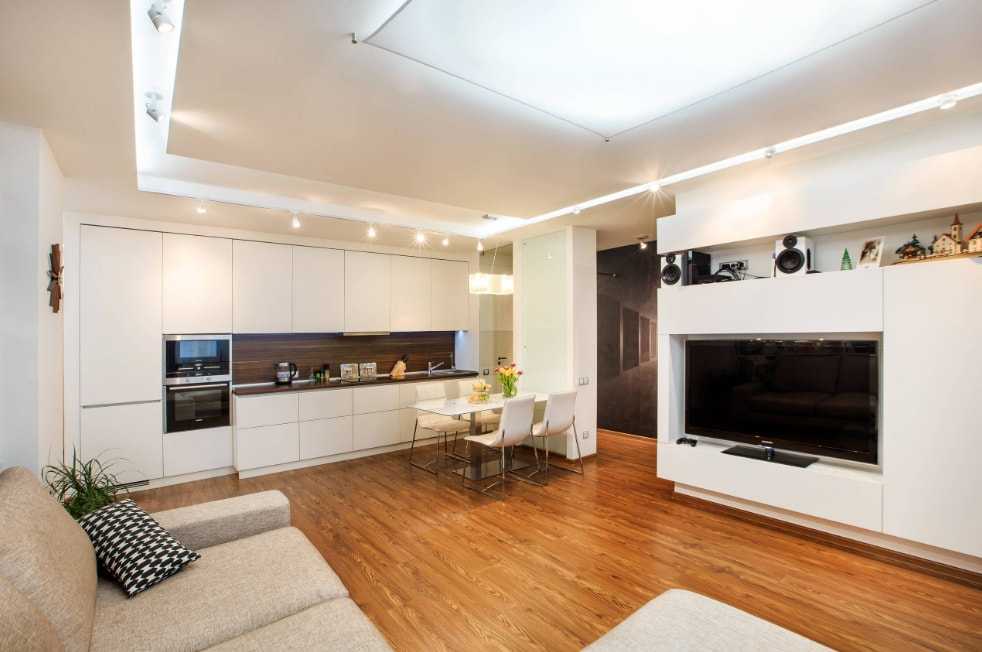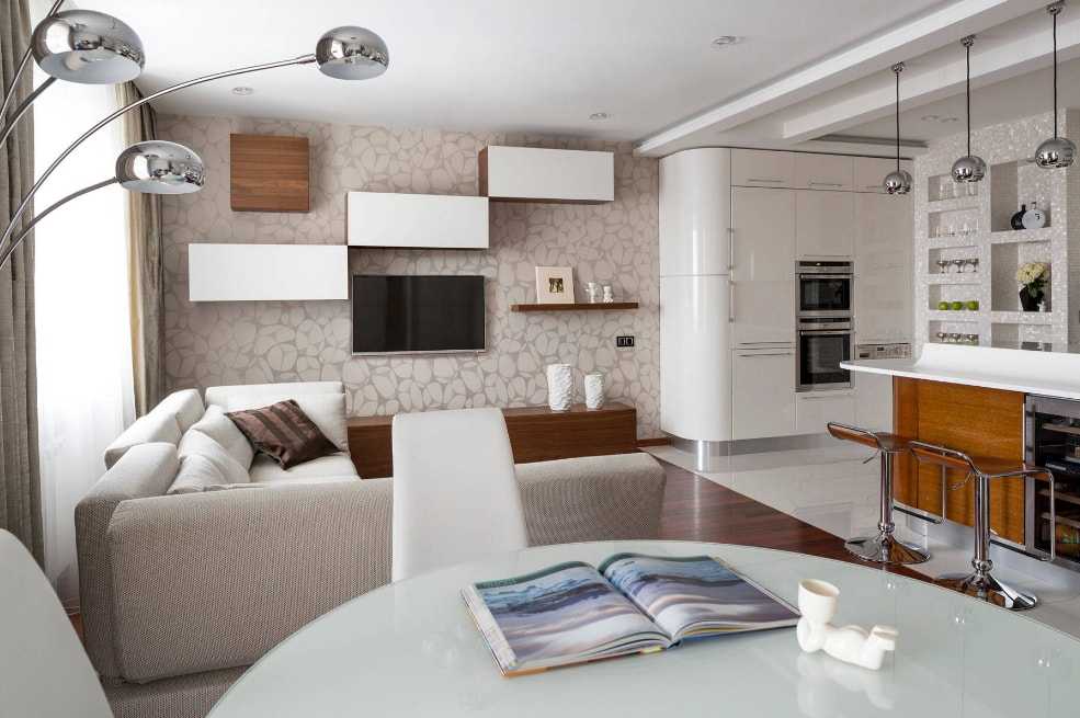 Правильное освещение способно изменить внешне комнату, подчеркнуть ее разделение на зоны. Место установки раковины должно быть освещено лучше всего, поэтому здесь нужно сконцентрировать большую часть светильников. Для места установки телевизора или экрана хорошее освещение не требуется. Неплохим вариантом может стать использование многоуровневого потолка из гипсокартона, в котором очень удобно устанавливать элементы освещения в требуемых местах. Точечные лампы будут освещать всю кухню-гостиную равномерно. В зоне для кухни потребуется центральное освещение и точечное. Центральную люстру или лампу лучше расположить непосредственно над столом. Для гостиной подойдут точечные светильники. Для создания уникальной атмосферы и уюта применимы настенные лампы, торшеры. Предпочтение можно отдать дорогим моделям, но бюджетные тоже могут неплохо вписаться в общую картину.