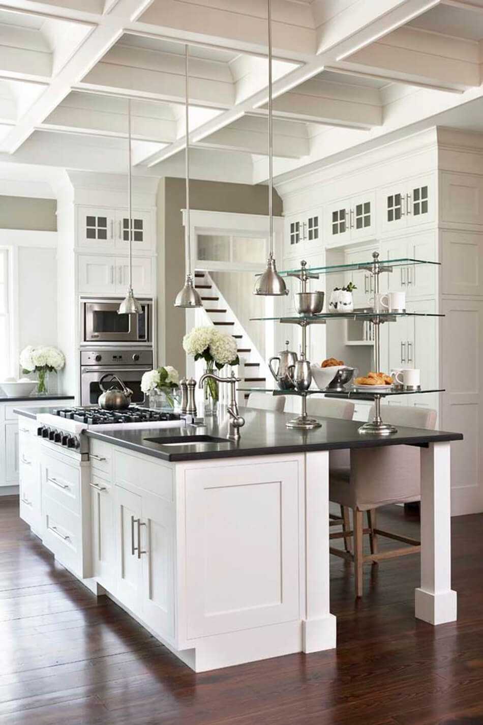 Контрастные балки под потолком на кухне смотрятся оригинально