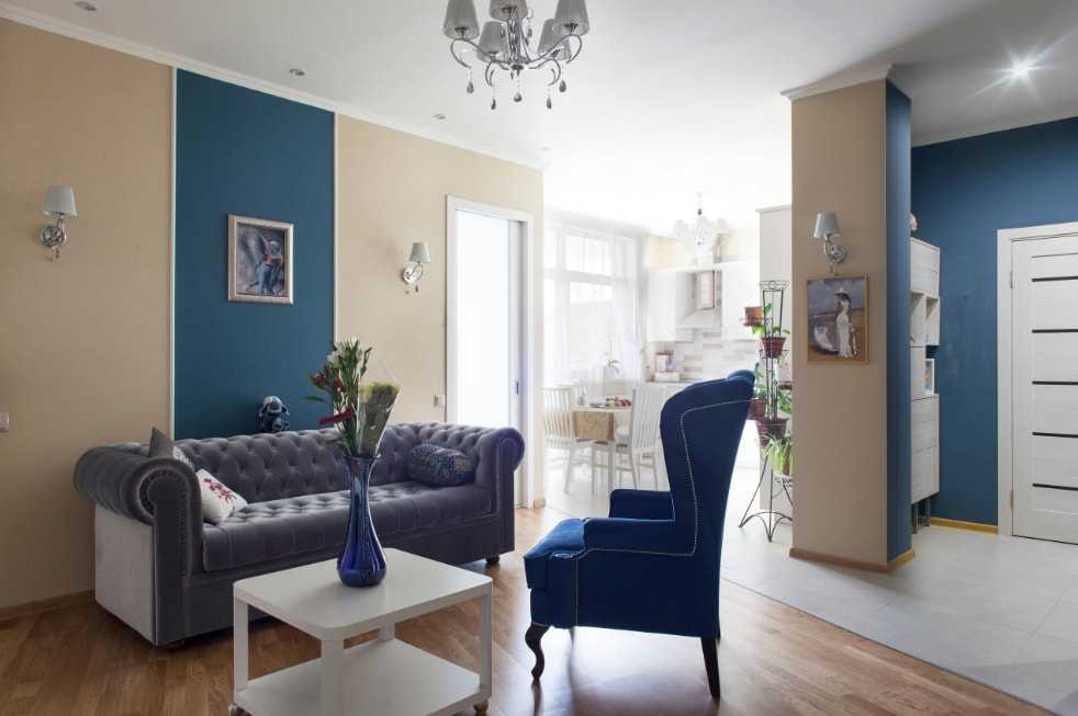 В декоре этой кухни-гостиной используются несколько оттенков синего цвета, который успокаивающе действует на каждого человека. Они применяются на части стены, диване и ковре. Таким образом общий дизайн помещения не перегружен деталями и в то же время выглядит интересно и не скучно.