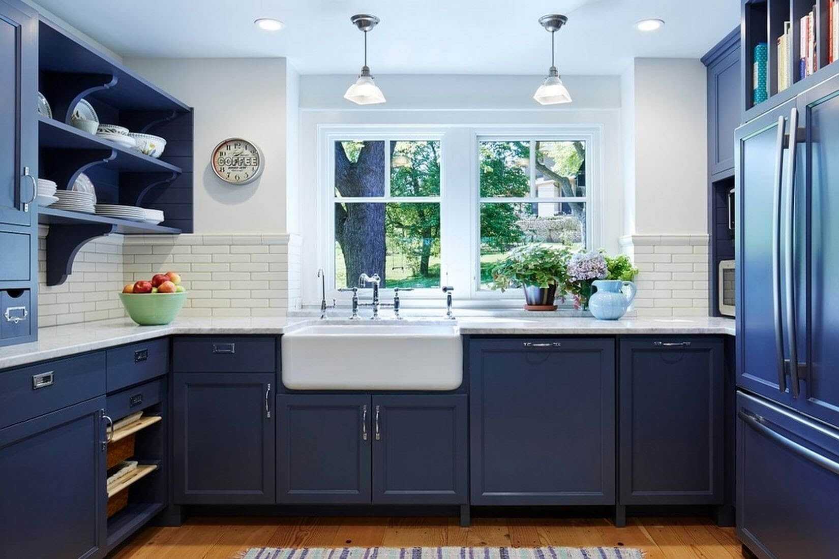 Светлая, просторная кухня-гостиная с ярким, освежающим элементом декора – шторами синего цвета. И это действительно потрясающее решение.