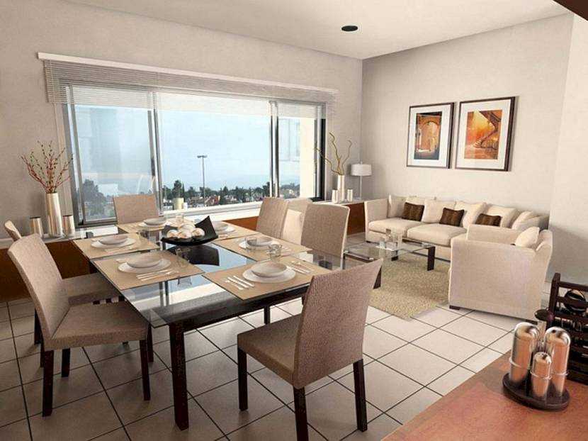 Гостиная столовая, дизайн которой выполнен в светлых, нейтральных тонах, выглядит просторной и свежей.