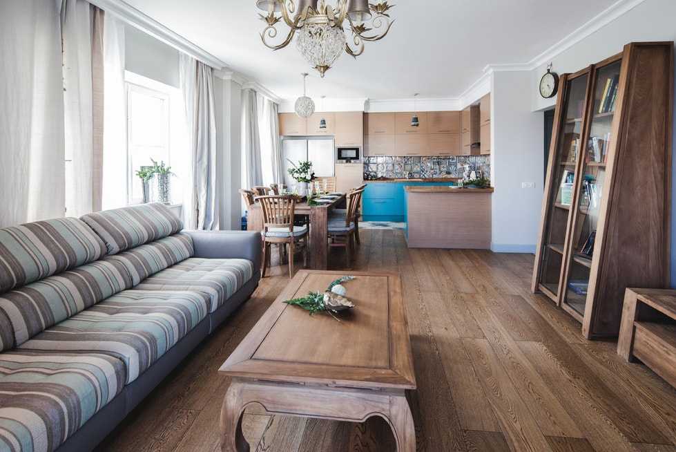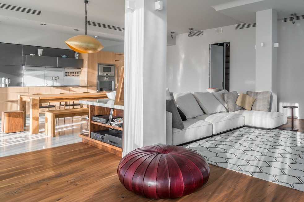 Поделит пространство и перепад уровня пола, разная расцветка стен или освещение. Например, в кухне пол из плитки, а в столовой – ламинат. Или в кухне яркий свет, а в гостиной – мягкий приглушенный.