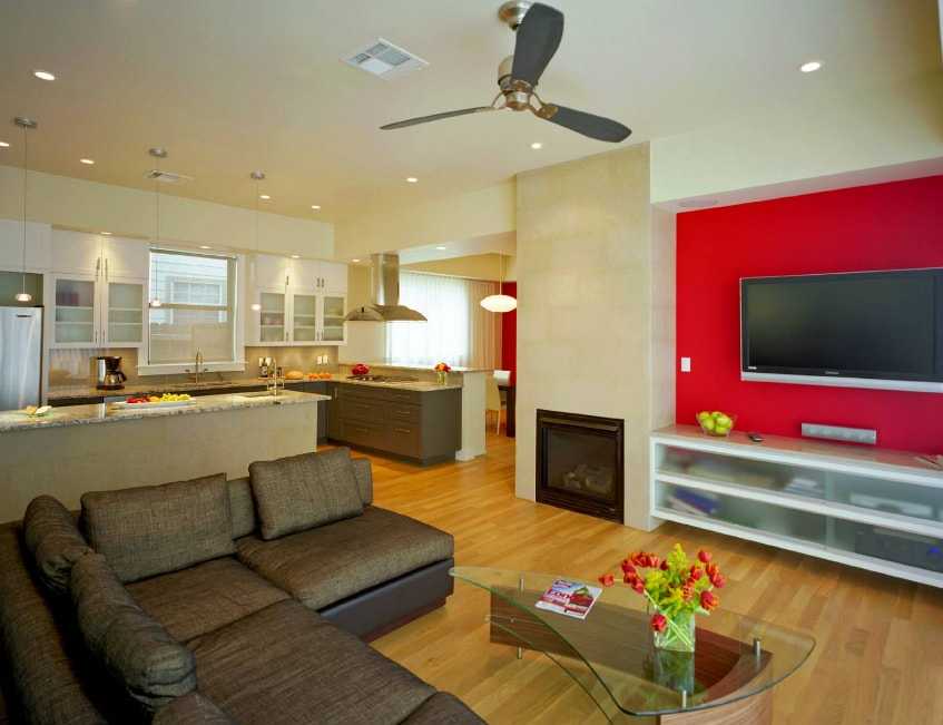 Довольно большая часть людей все же предпочитают делать кухня-гостиную более светлой или же яркой. Согласитесь, чтобы добиться такого эффекта можно просто добавить несколько насыщенных, броских акцентов.