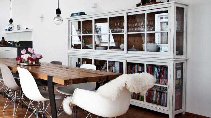 Глянцевые поверхности нравятся далеко не всем, но они отражают свет, добавляют объем, и потому выгодны в небольшой гостиной-столовой. Если вы против глянцевых фасадов, подумайте о глянцевом натяжном потолке. С этой же целью рекомендуется в качестве декора использовать зеркала.