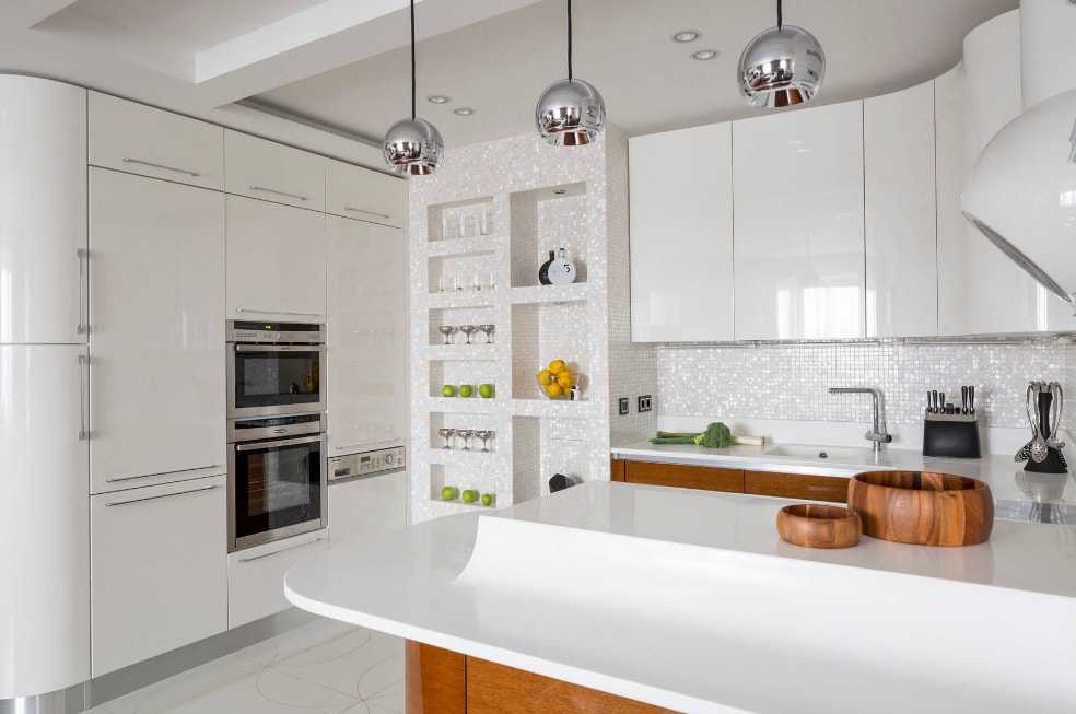 Стильно смотрится молочный или черно-белый интерьер в такой кухне. К основному светлому тону можно добавить несколько ярких акцентов. Как пример, красочные жалюзи или декорированная столешница.