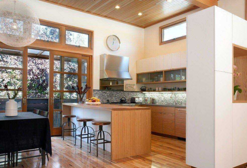 Рассмотрим и такой интересный дизайн кухни в частном доме – фото кухни-студии.