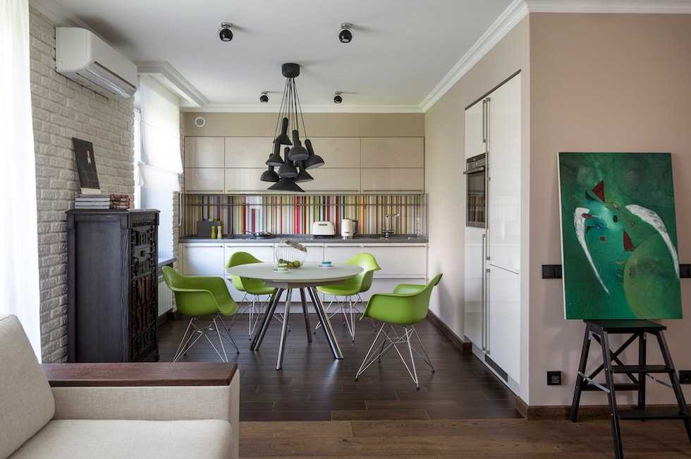 Еще один пример того, что ярким акцентом может выступить что угодно. В данном случае – это яркие зеленые стулья и очень необычная люстра, которая состоит из нескольких. А картина в этом интерьере играет далеко не последнюю роль.