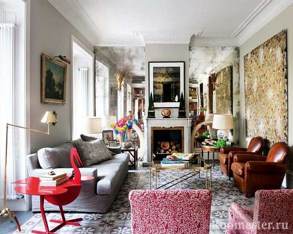 - Богемная хаотичность. Такой случай предполагает минимальную расстановку мебели. Камин полностью по форме повторяет старинную печь, установленную в стене или углу помещения.
