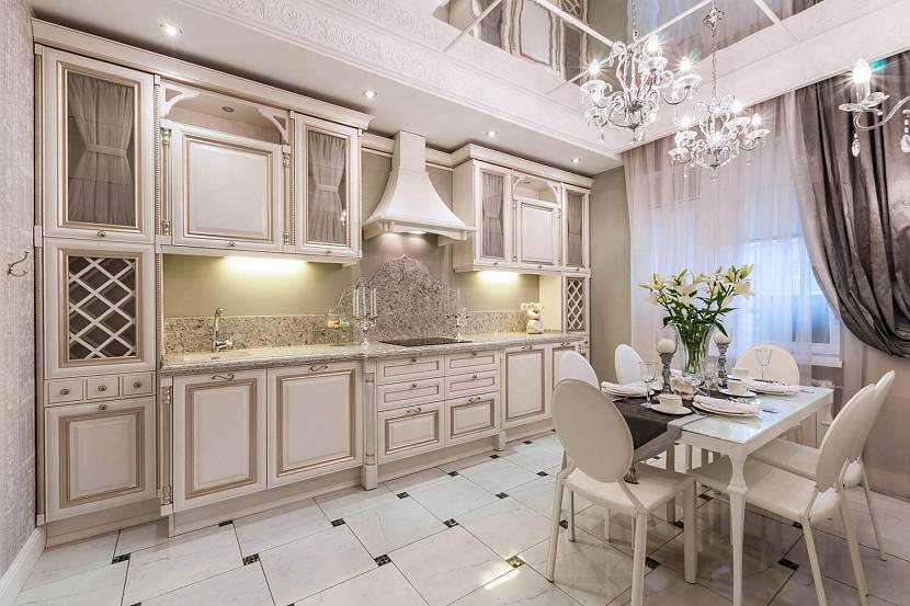 Предпочтительно делать строгий потолок белого цвета. Лепнина, состоящая из прямых линий, подчеркивает симметричность дизайна и добавляет порядка в помещение. Также допустимо использовать натяжной потолок как с матовым, так и глянцевым покрытием.