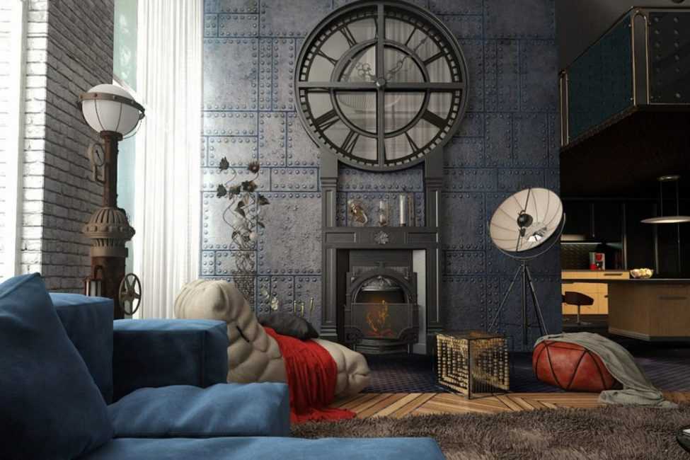 В загородном доме рекомендована установка камина со стеклянными или металлическими элементами. Открытый камин соответствует духу индустриализации, характерной для прошлого века. Желательно устраивать в кирпичной стене место под очаг, для облицовки использовать плитку.