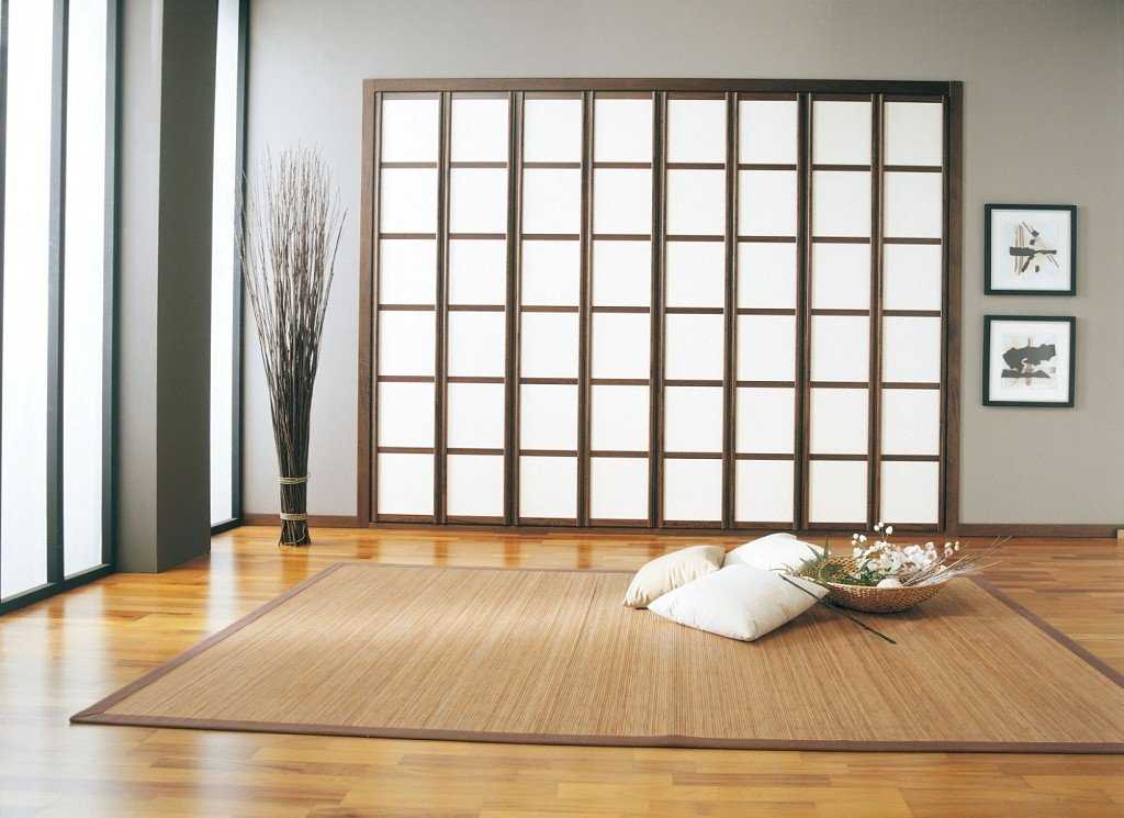 - традиционные предметы обстановки – низкие столики, подушки для сиденья, ширмы, встроенные шкафы, передвижные комоды;