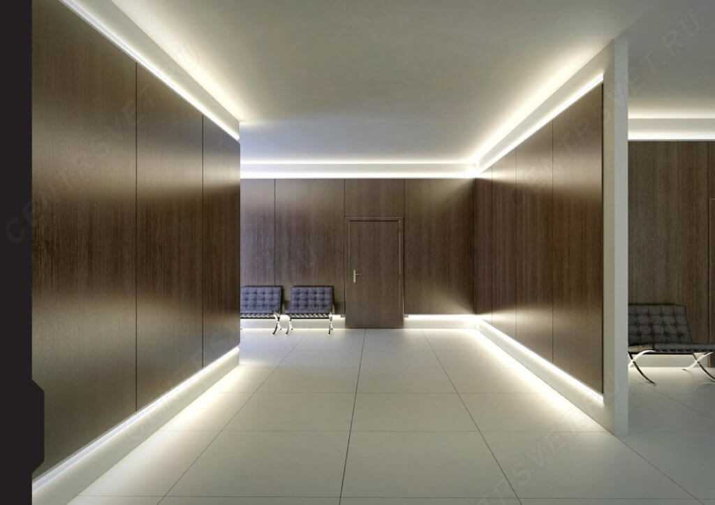 Светодиодные ленты, дюралайт, неоновые ленты служат декоративной подсветке. Они монтируются по периметру потолка, над шкафами. Расположенные вдоль плинтуса, под шкафами светодиодные ленты зрительно увеличат пространство. Также они служат разделению на зоны.