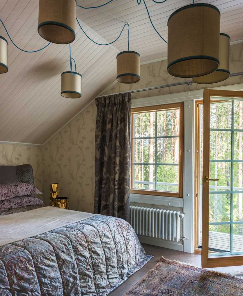 Один из самых главных вопросов в планировании такой зоны — как расположить кровать: у высокой стены или у низкой? Оба варианта актуальны, но если выбрали второй, важно предварительно рассчитать, не будут ли те, кто спит на кровати, вставая задевать головой наклонную стену. Этот принцип работает как для дизайна мансарды с двускатной крышей на даче, так и для пространств с односкатной кровлей.Оптимально, если к спальне будет примыкать санузел и выход на террасу: в этом случае мансарда станет обособленным приватным помещением с собственной зоной отдыха
