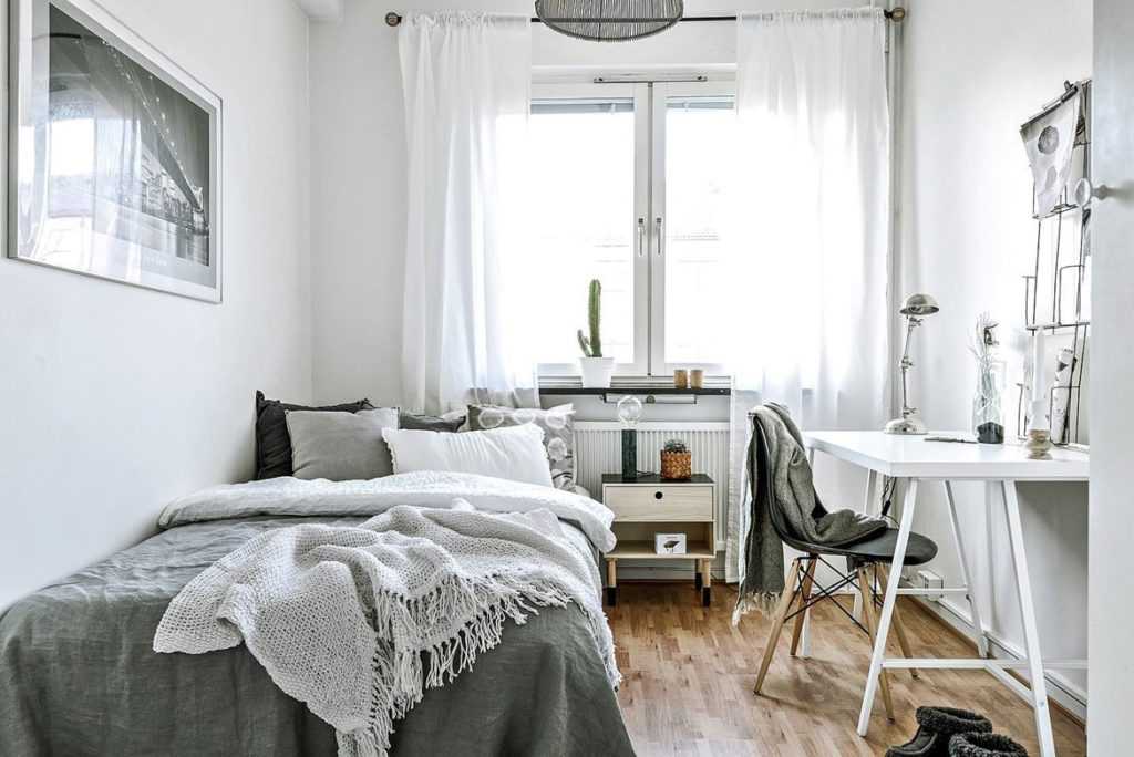 Что не будет подходить для стен в узкой спальне? Откажитесь от отделки, которая торчит и занимает место. Штукатурка, панели, пробковые панели 3D или кирпич не будут подходить для узкой комнаты.