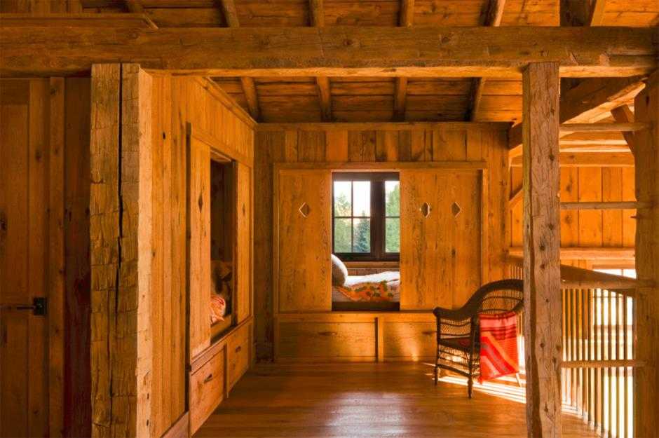 Камин с живым огнем напоминает печку-буржуйку, находясь между спальной и гостиной зоной, объединяет их общим теплом. Спальня обособленна, но в то же время не находится в замкнутом пространстве, поэтому не выглядит слишком тесной. Большое окно дает возможность любоваться звездным небом. Старинный манекен служит оригинальным декором и местом, куда можно бросить одежду. Два прикроватных короба играют роль тумб и вместительных ящиков одновременно.