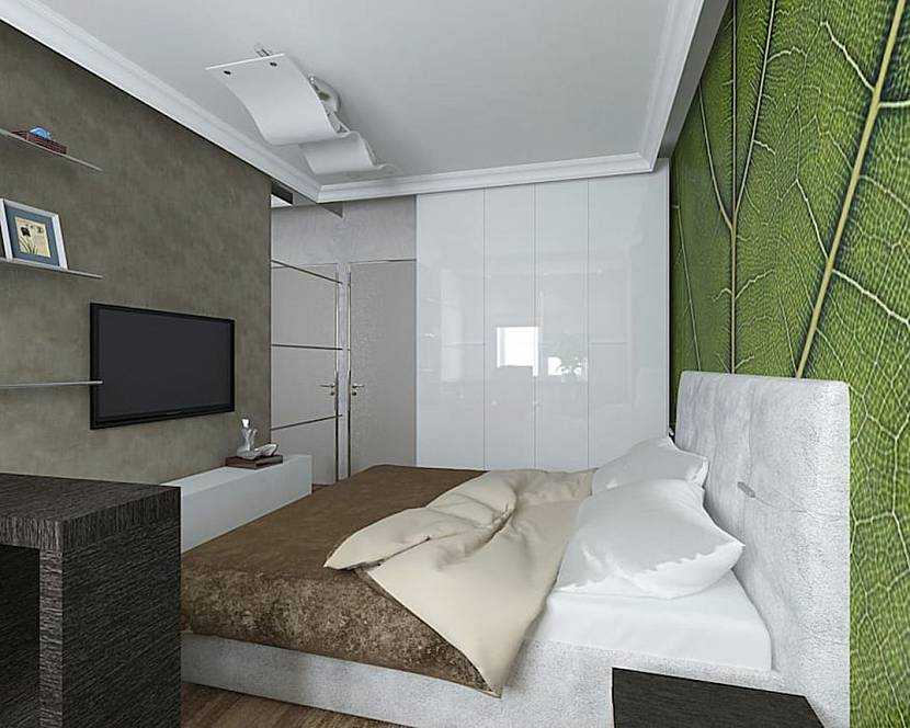 Гамма подбирается блеклая (важно). Такая компоновка визуально удлинит короткую часть спальни