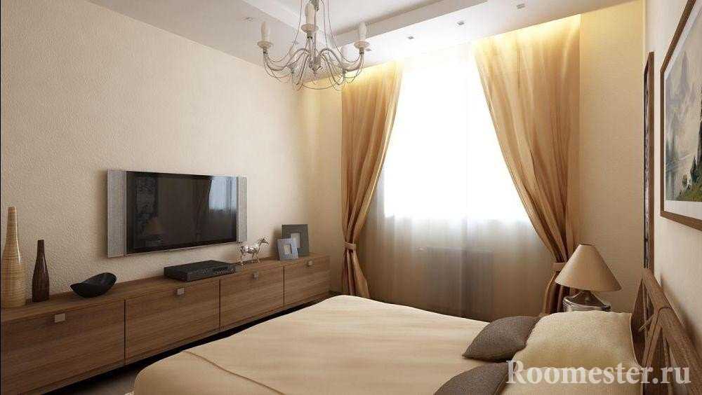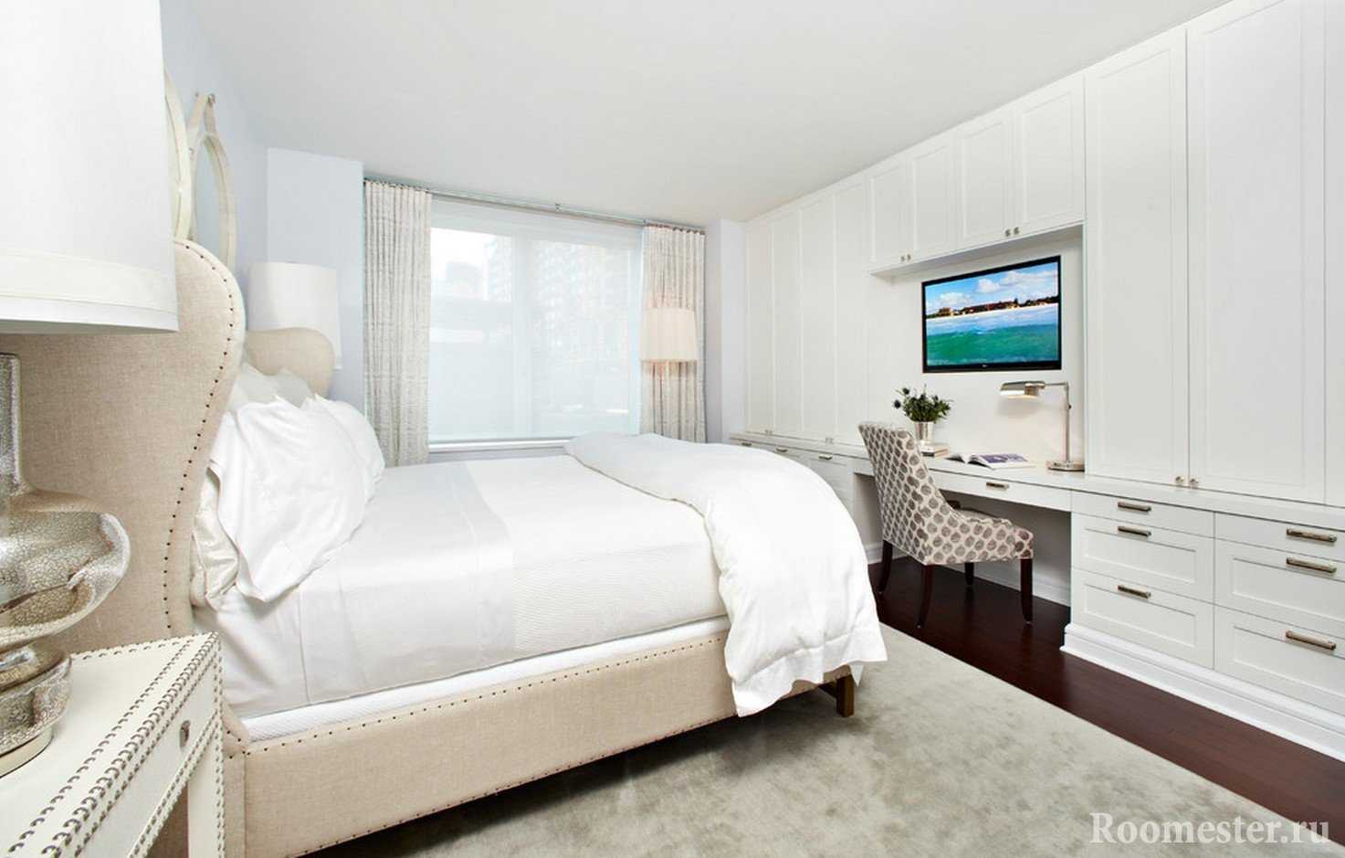 Телевизор и шкаф расположены в нишах стен. Такая расстановка элементов позволяет максимально сэкономить пространство. Белые стены и потолок способствуют визуальному увеличению комнаты. Плотный текстиль светлого оттенка благозвучно вписывается в общую картину интерьера. Он послужит защитой от проникновения солнечных лучей по утрам.