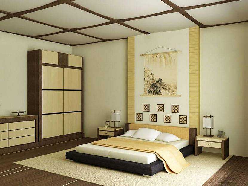 Японское оформление ориентировано на компактные помещения. В спальне в 10 квадратов рационально используют каждый сантиметр. В комнате минимум мебели – низкое ложе и тумбочки. Шкафы спрятаны под декоративными панелями, напоминающими полупрозрачные перегородки. Под систему хранения задействовали пространство под кроватью.