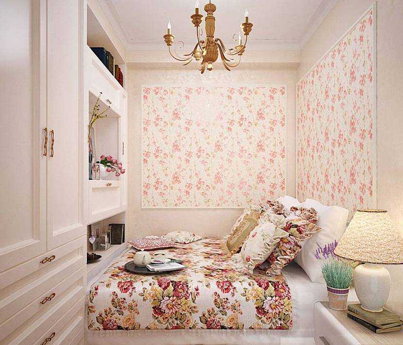 Едва заметные узоры на обоях не скрадывают полезную площадь. С принтом на стенах перекликается текстиль на окнах, кровати. По периметру потолка простые молдинги, в центре – небольшая рожковая люстра с состаренными абажурами. Единичные декоративные элементы располагают на полке или стеллаже.