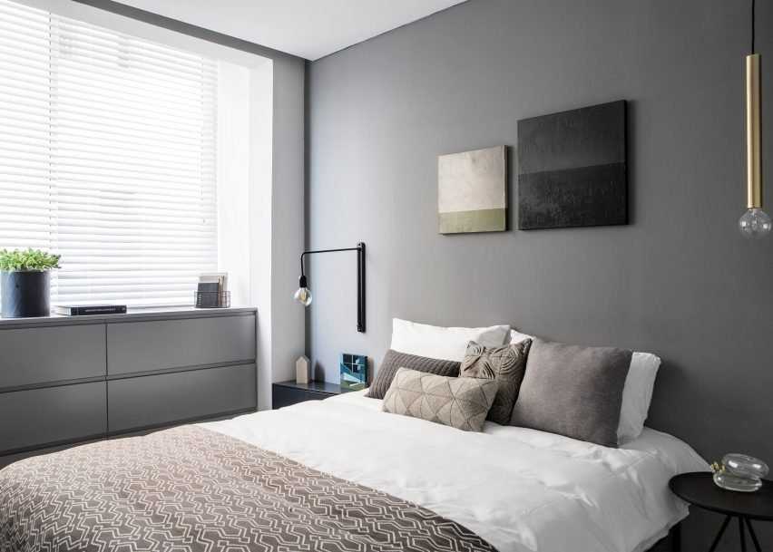Как можно оформить маленькую комнату в темных тонах, можно видеть на данном примере. Графитовые стены и коричневый шкаф вписались в интерьер благодаря сочетанию со светлой стеной и полом, большому белому окну без занавесок и белой кровати.