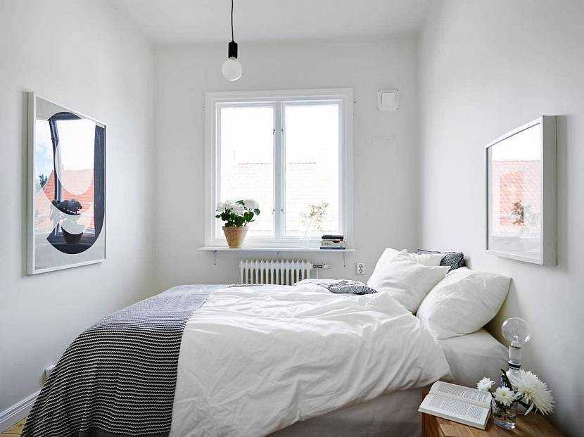 Недостаток квадратов в спальне компенсируют хорошим освещением и светлой отделкой. Огромные окна не драпируют или используют жалюзи в тон стен. Снежную стерильность дизайна подчеркивают темные полы и мебель, серый текстиль. В изголовье кровати часто монтируют полку с живыми растениями и семейными фотографиями. На потолке – светильник простой формы.