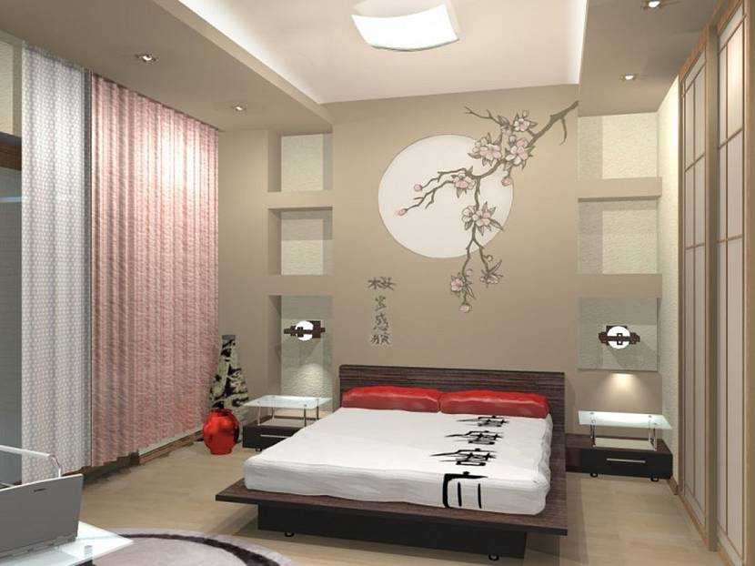 Комнату оформляют в светлых природных оттенках – белый, цвет бамбуковой бумаги или бежевый. В качестве контрастов используют коричневый или графитовый. На окнах – японские шторы или лаконичные ролеты. Из декора уместны миниатюрные композиции с живыми растениями и статуэтками.
