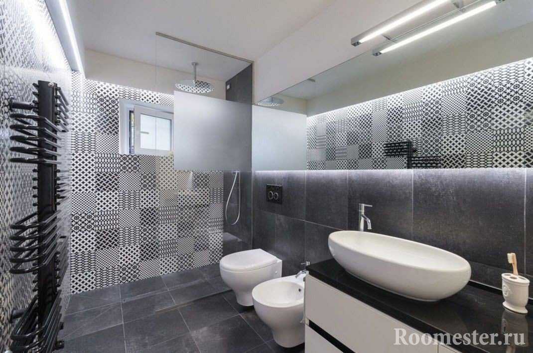 При выборе современных ветвей стилистики (например, ар-деко, брутализма, модерна) опираются на современность фактур и технологичность каждого элемента обустройства. Это обязательно глянцевый тип облицовки, способный визуально расширить стены и поднять потолок.