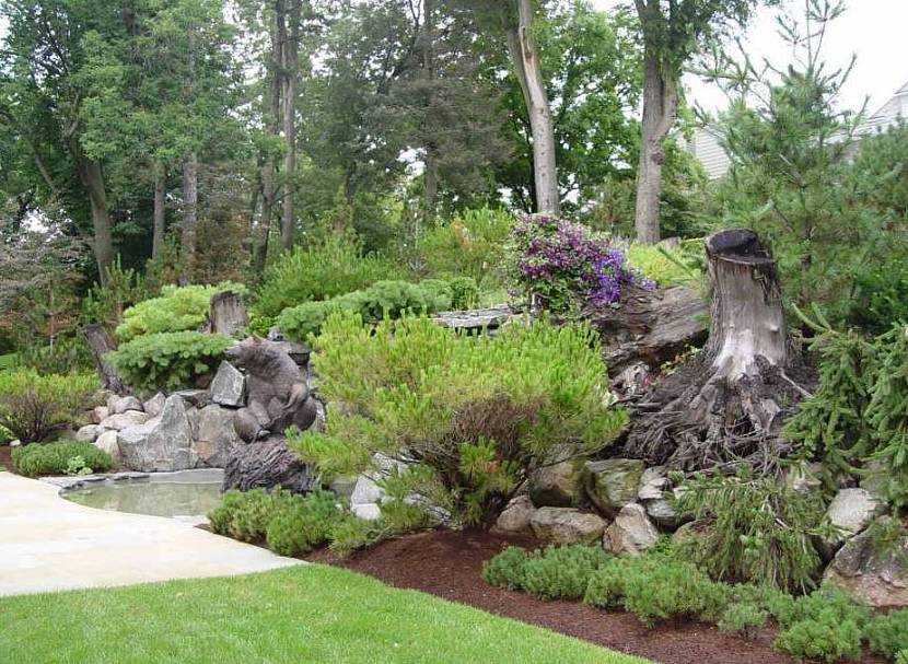 Для устройства рутария используют специально завезенные пни, коряги. Из них делают сложные садовые декоры, в том числе ярусные.
