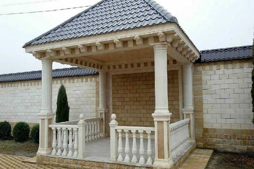 Примыкающая к забору беседка сделана из бетона, кирпича и мрамора, крыша – металлочерепицаИсточник studiya-kamnya.com