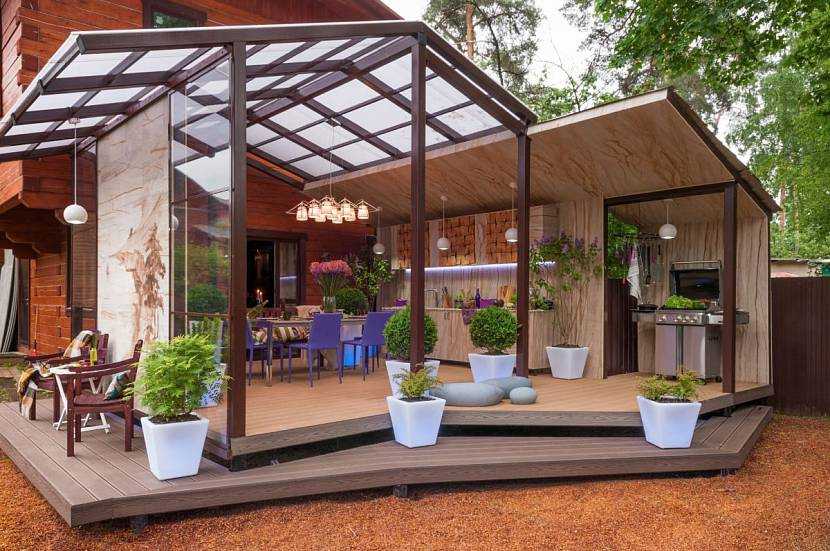 Площадки с навесами без стен называют полуоткрытыми. Они выглядят более просторными и современными. Чтобы обеспечить зону отдыха максимальным количеством естественного света, можно сделать навес из прозрачных материалов.