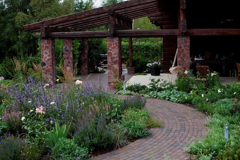 Отдельные элементы декора сада могут повторяться, как бы образуя стилистический лейтмотив. Это могут быть садовые дорожки из дикаря, распила бревен, перголы с вьющимися растениями.