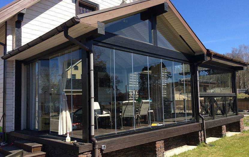 Терраса с застеклением раздвижными системами – летом они практически незаметно складываются в одну сторону, зимой раздвигаютсяИсточник balkon-fasad-spb.ru