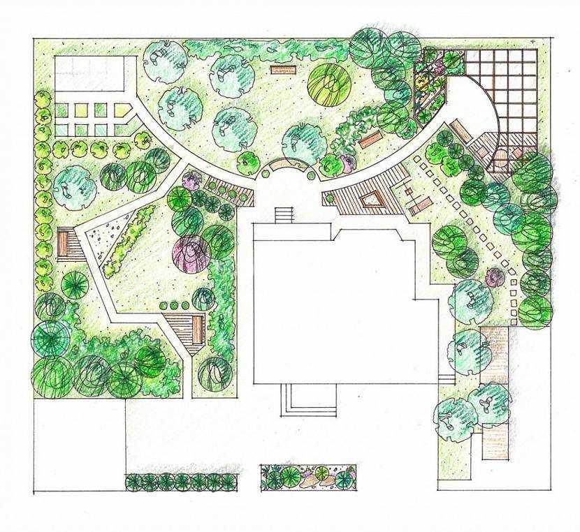Проект ландшафта представляет собой план, на который изначально наносятся уже существующие объекты на участке, а потом все элементы, которые будут привнесены в дизайн участка в процессе его обустройства. Сначала отмечается сам дом и дополнительные постройки, такие как гараж, терраса, беседка, баня, бассейн, теплица.