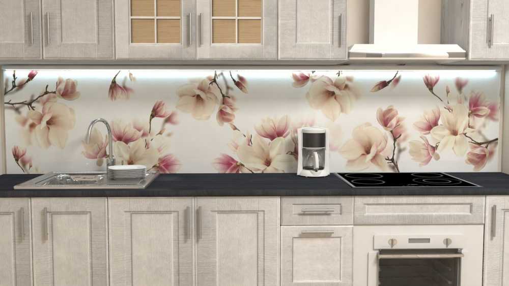Панели ПВХ позволяют проявить свои творческие способности при установке фартука для кухни. Например, в светлом помещении, оформленном в неброских серых тонах со строгим белым кухонным гарнитуром, придется к месту яркая полоса из маков на защитном покрытии стены между верхним и нижним ярусом мебели.