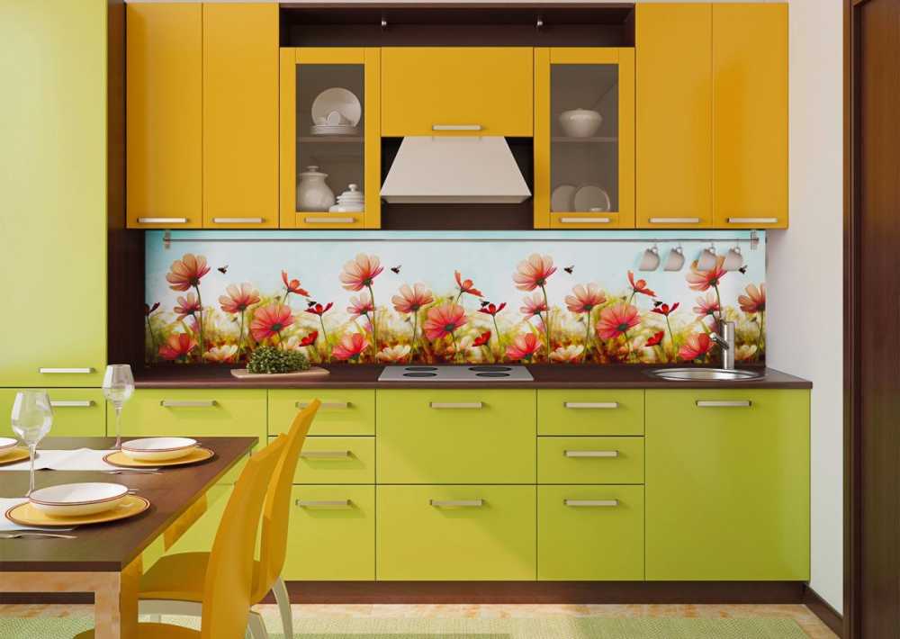 В продаже можно найти панели, которые по оттенку и рисунку совпадут с цветом самого гарнитура и прекрасно его дополнят, придав яркости и оригинальности всему пространству кухни.И