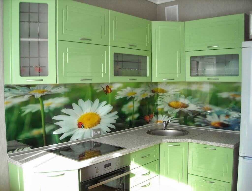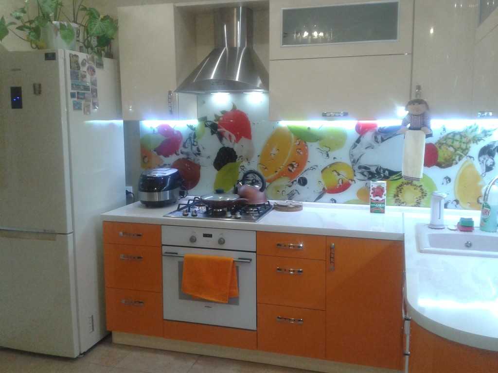 Такой рисунок всегда будет создавать настроение на кухне. Но стоит понимать, что слишком яркие краски могут быстро надоесть, а заменить такое изображение нельзя — только вместе со стеклом.