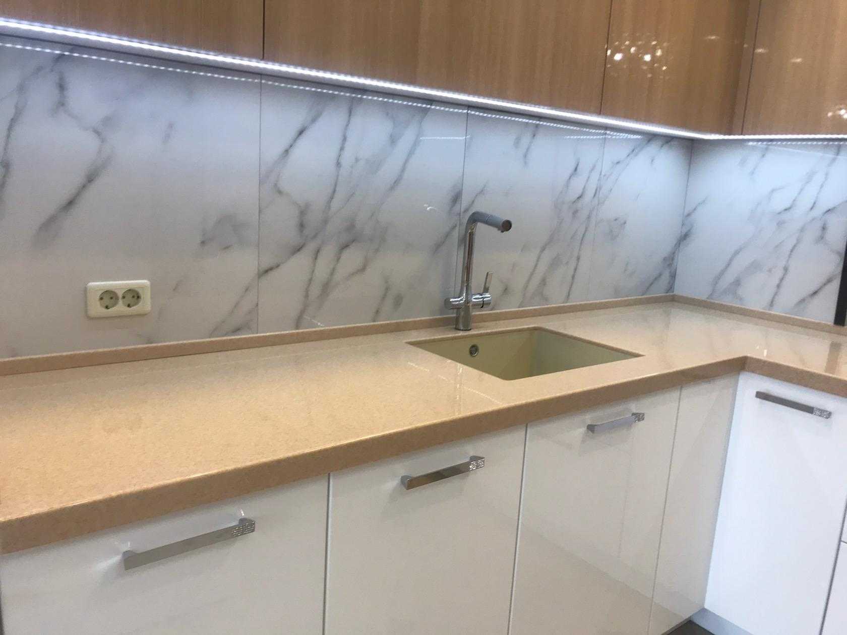 Цена закаленного стекла на фартук кухни начинается от пяти тысяч рублей за квадратный метр. Это самый дорогой вариант