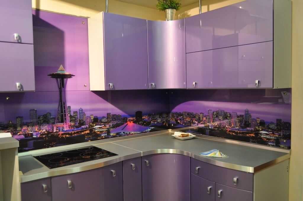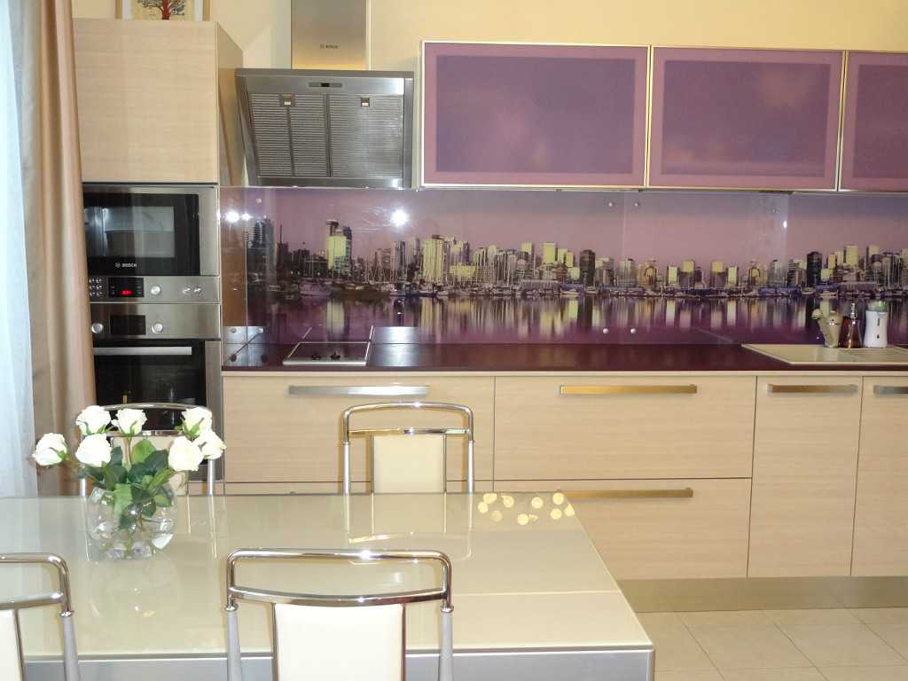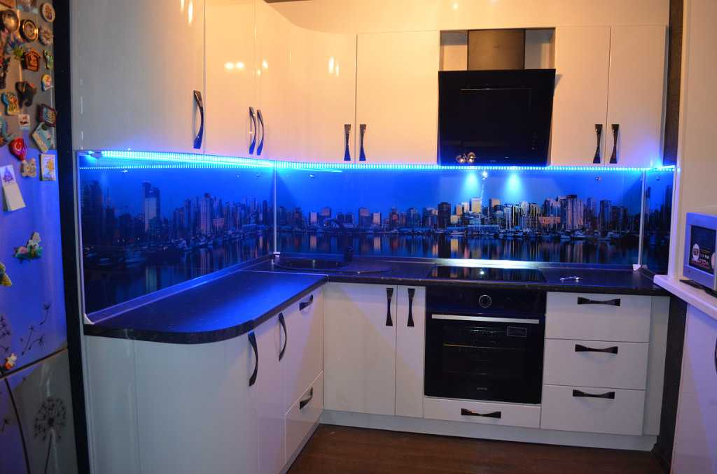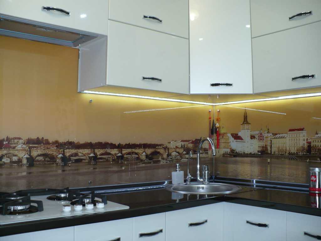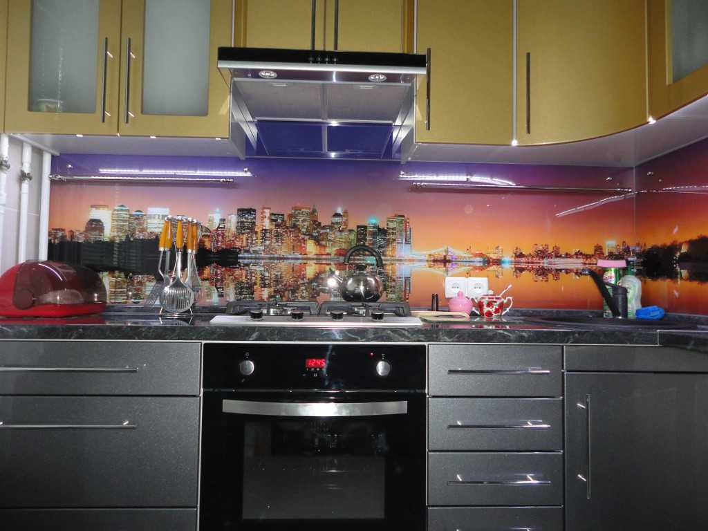 Если вы хотите всегда производить впечатление на гостей и любите необычные дизайнерские решения, присмотритесь к стеклянным скинали с подсветкой. Добавить неординарности интерьеру поможет фотопечать изображения вечернего вида на один из мегаполисов. Вечером вы сможете наслаждаться видом Парижа или Нью-Йорка, попивая чай или кофе.