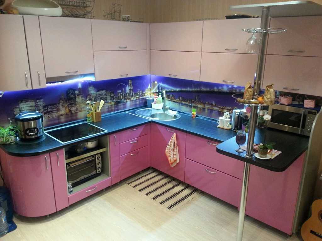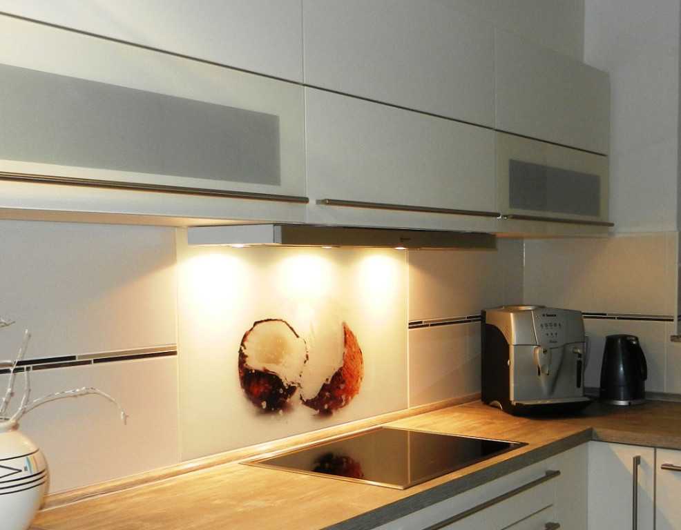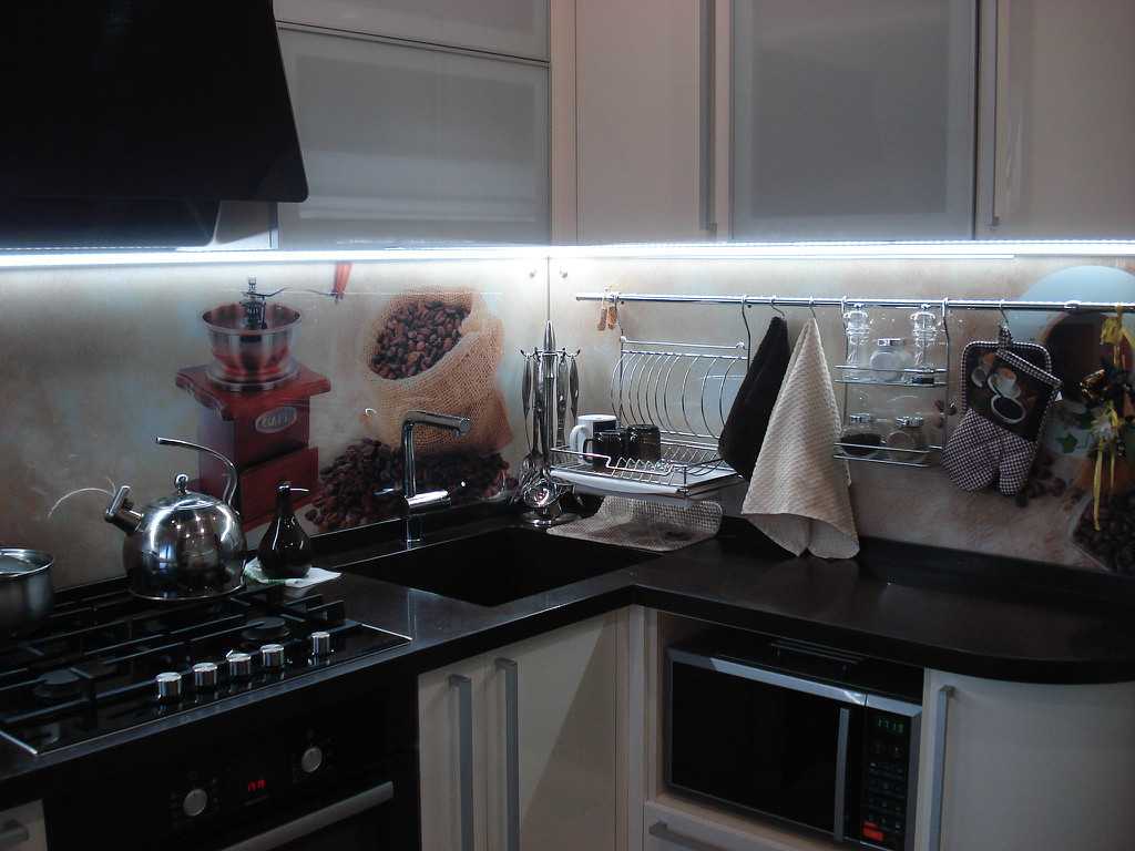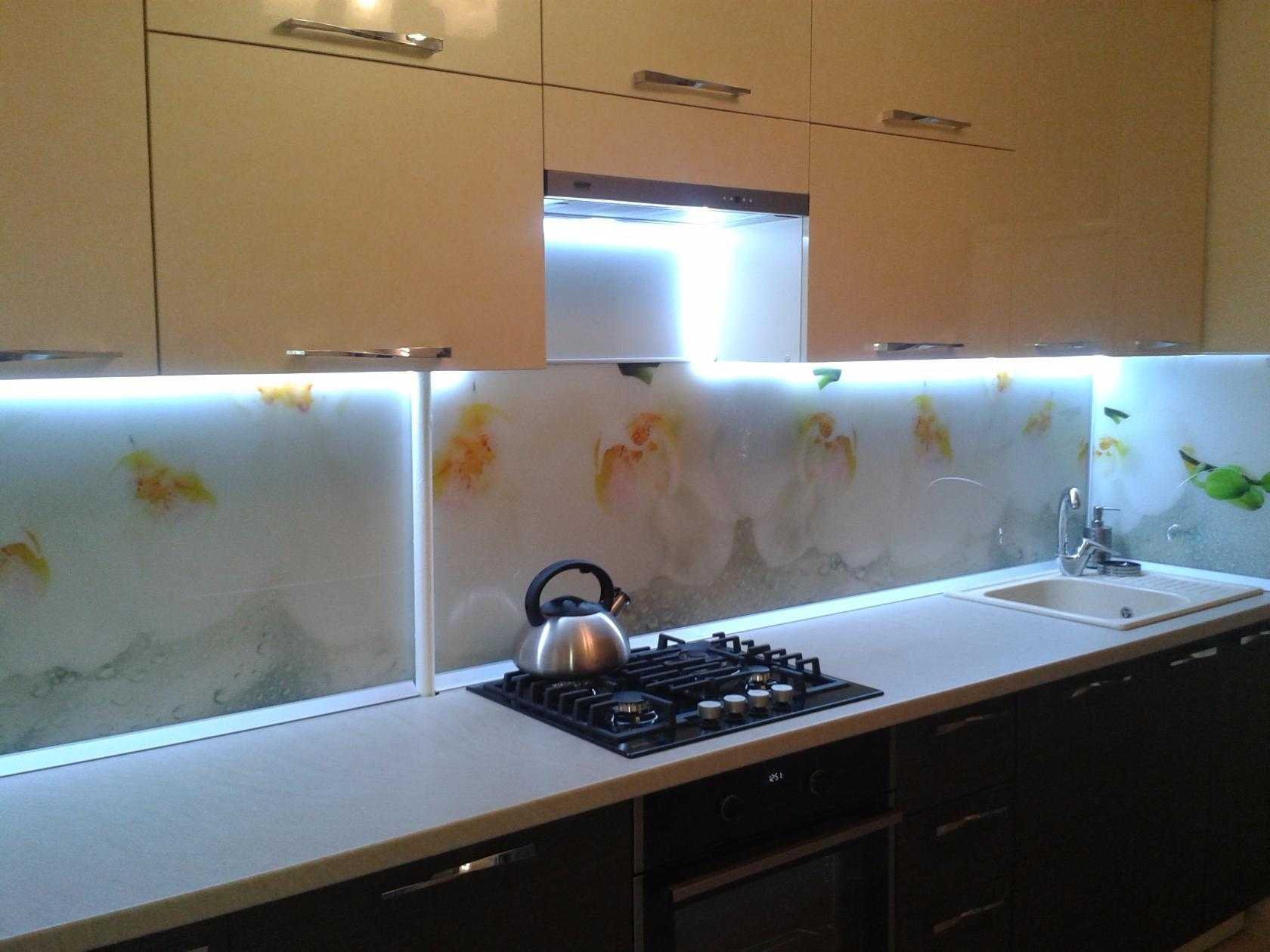 Если вы хотите всегда производить впечатление на гостей и любите необычные дизайнерские решения, присмотритесь к стеклянным скинали с подсветкой. Добавить неординарности интерьеру поможет фотопечать изображения вечернего вида на один из мегаполисов. Вечером вы сможете наслаждаться видом Парижа или Нью-Йорка, попивая чай или кофе.